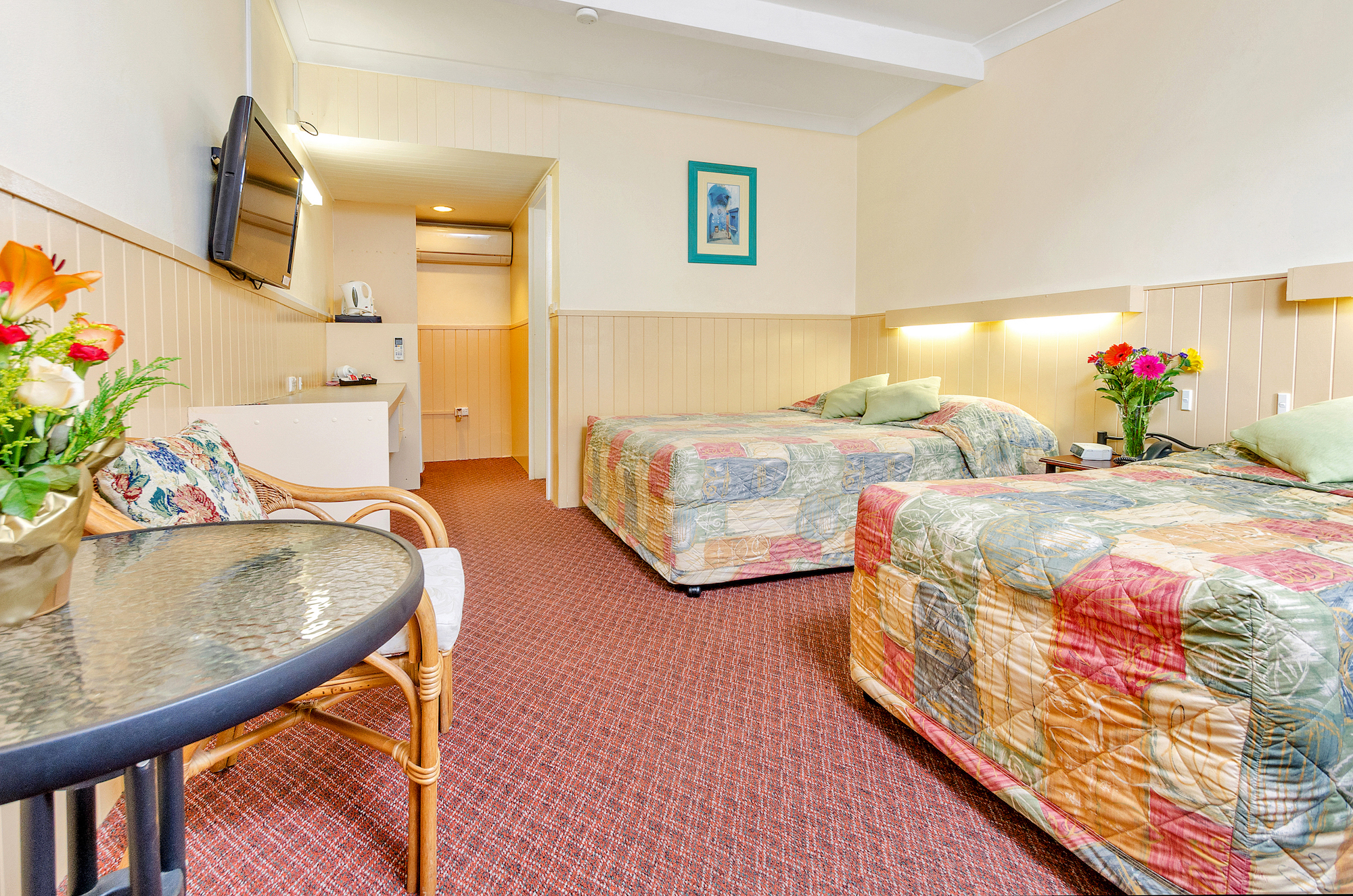 This Standard Twin Room consists of 1 Queen Bed and 1 Single Bed and contains air conditioning, flat screen TV, tea and coffee making facilities, iron and ironing board, hairdryer and ensuite with walk in shower. Also includes free wifi and parking!
