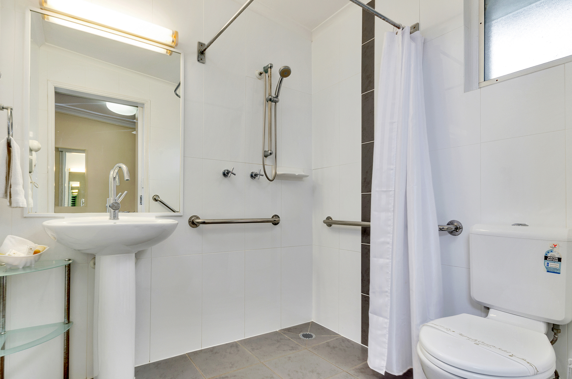 This Accessible Deluxe Queen Room consists of 1 Queen Bed and contains air conditioning, flat screen TV, tea and coffee making facilities, iron and ironing board, hairdryer and ensuite with walk in shower. Also includes free wifi and parking!